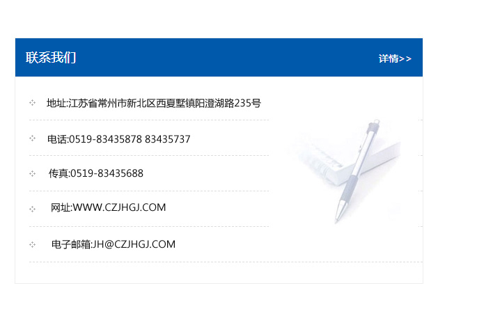 地址:常州市新北區友邦商務大廈1幢16、17層  電話:0519-85101652  傳真:0519-85112595  郵編:213022  網址:www.cz-jiayue_cn.120szb.com  郵箱:xiajifengaa@163.com